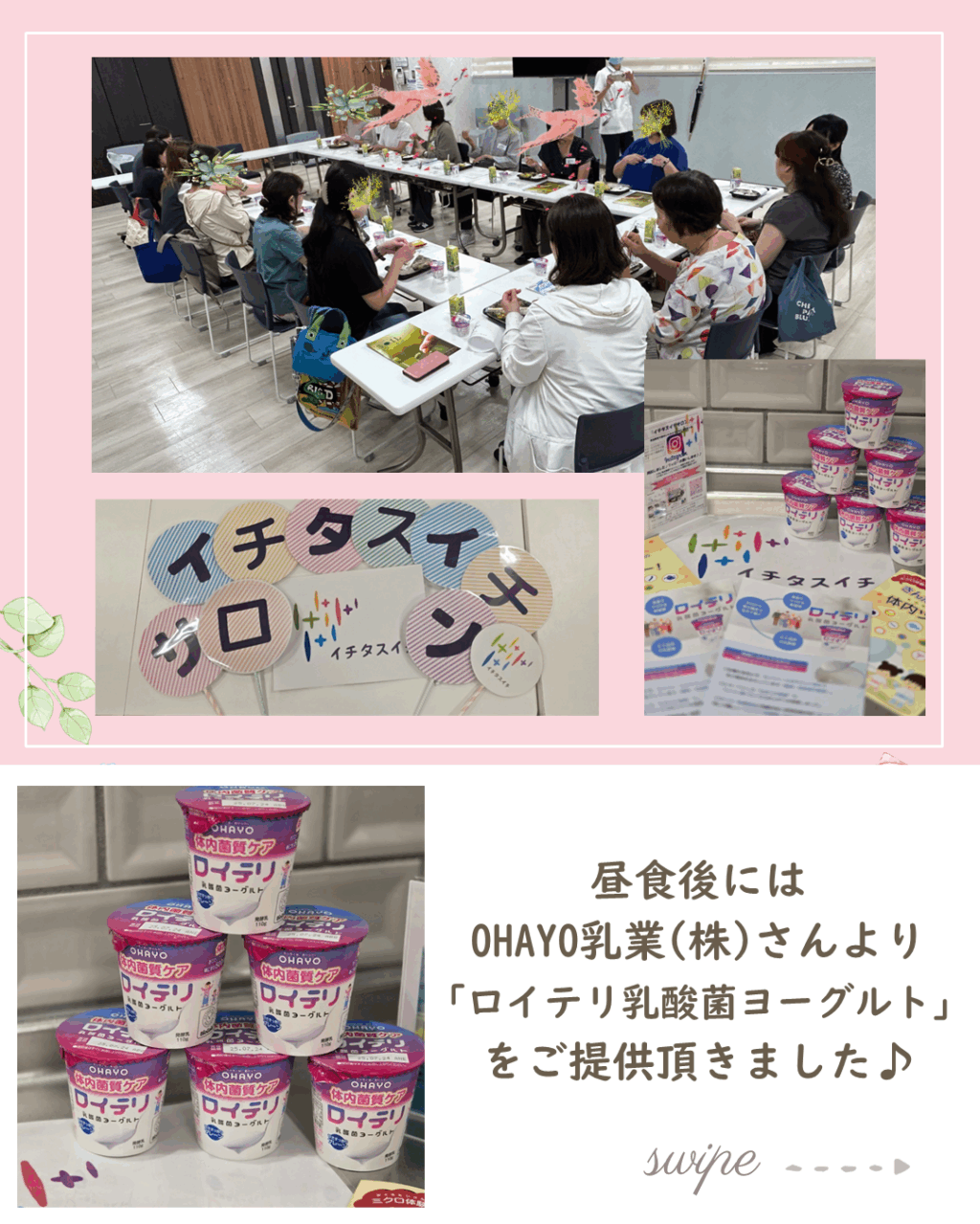 イベントではお弁当をご用意しました♪今回のお弁当は「なないろ亭」です。こちらのお弁当は就労継続支援B型「SOIL」の利用者さんが働いている施設です。とってもボリューミーなお弁当で配達もしていただけます。昼食をとりながらそれぞれのテーブルにてお弁当を食べながら交流会が始まりました。食後にはオハヨー乳業(株)さんよりご提供頂きました「ロイテリ乳酸菌ヨーグルト」を召し上がって頂きました。やさしい甘みのあるヨーグルトで「おいしい」「これを食べて腸活ができるの?いいですね」との意見も頂きました。