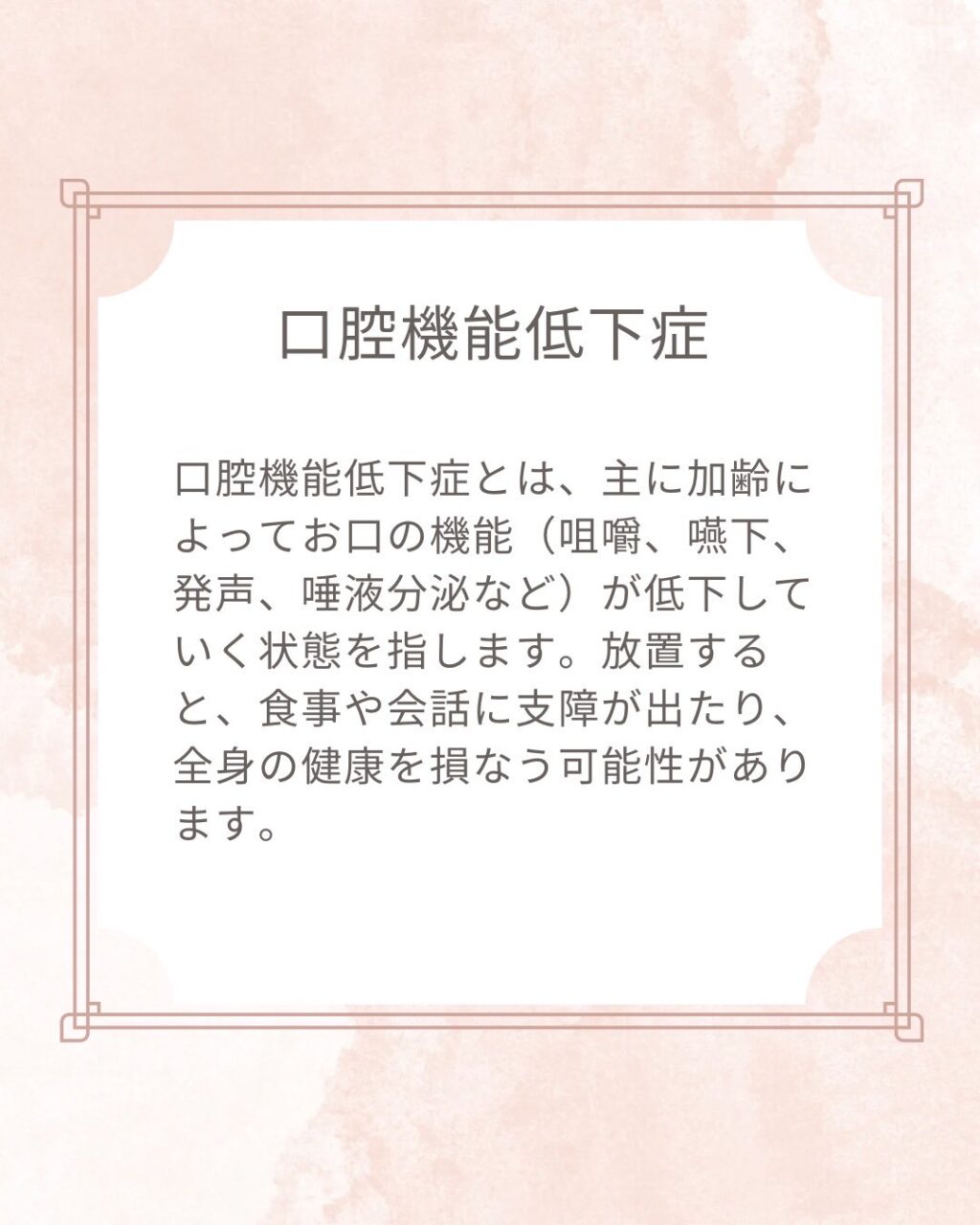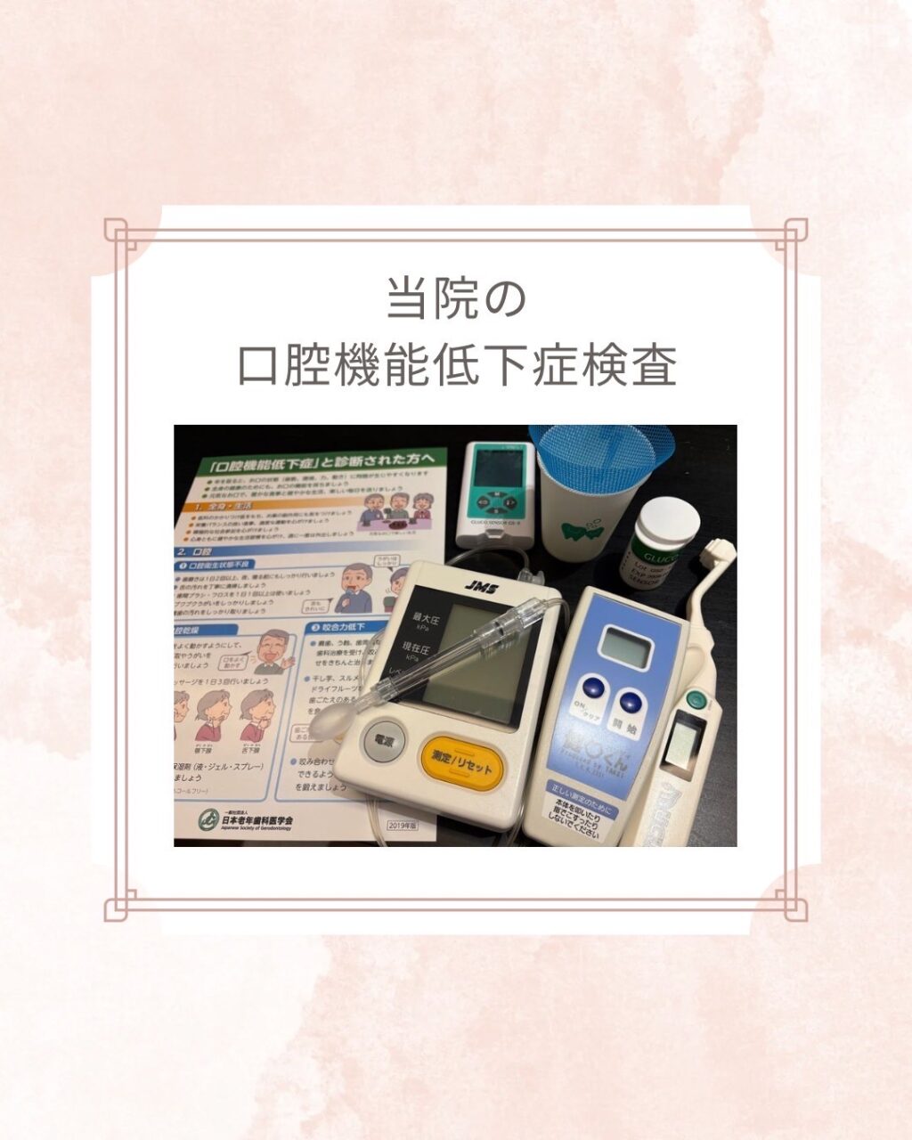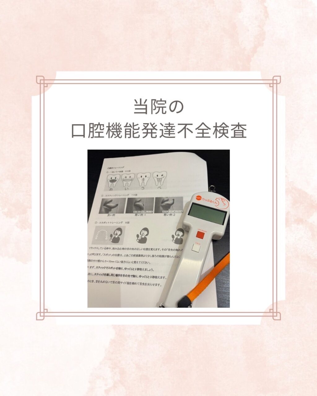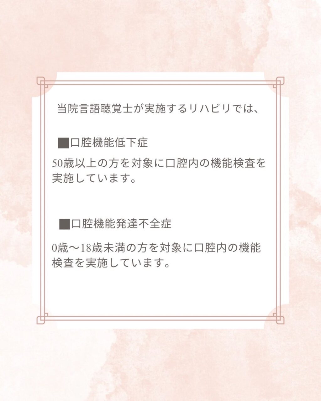 外来では、50歳以上の方に対して、 口腔機能低下症検査及び訓練を、18歳以下のお子様に対しては、 口腔機能発達不全症検査及び訓練を実施しています。
