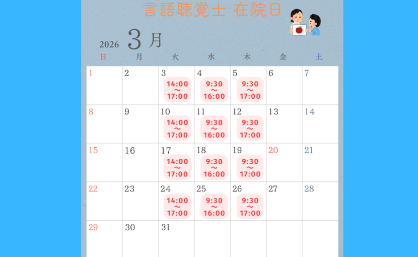 2026年3月は上記スケジュールにて言語聴覚士が在院しております。